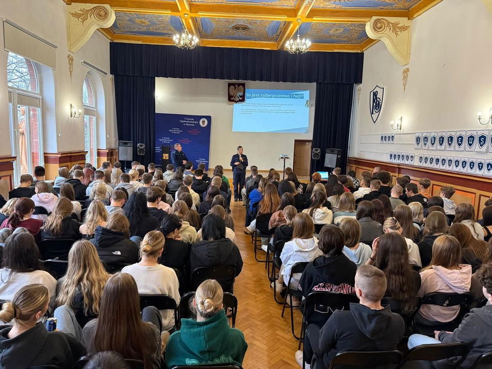 Funkcjonariusze Komendy Powiatowej Policji w Sławnie przeprowadzili debatę w auli I Liceum Ogólnokształcącego, omawiając zagrożenia związane z hejtem i cyberprzestępczością oraz konsekwencje prawne nieodpowiednich zachowań w sieci.